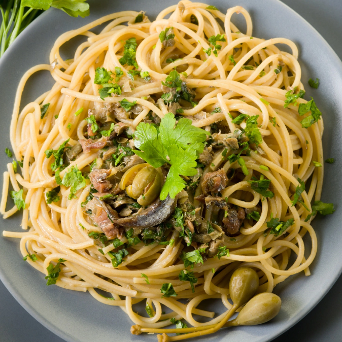 Spaghetti al pesto di capperi e alaccia Ingredienti: 200 g di spaghetti Olio extravergine d’oliva q.b Sale q.b. per il pesto: 8 Filetti di