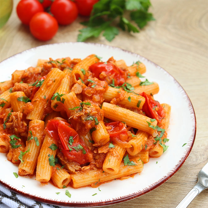 Rigatoni con alaccia e crema di peperoni